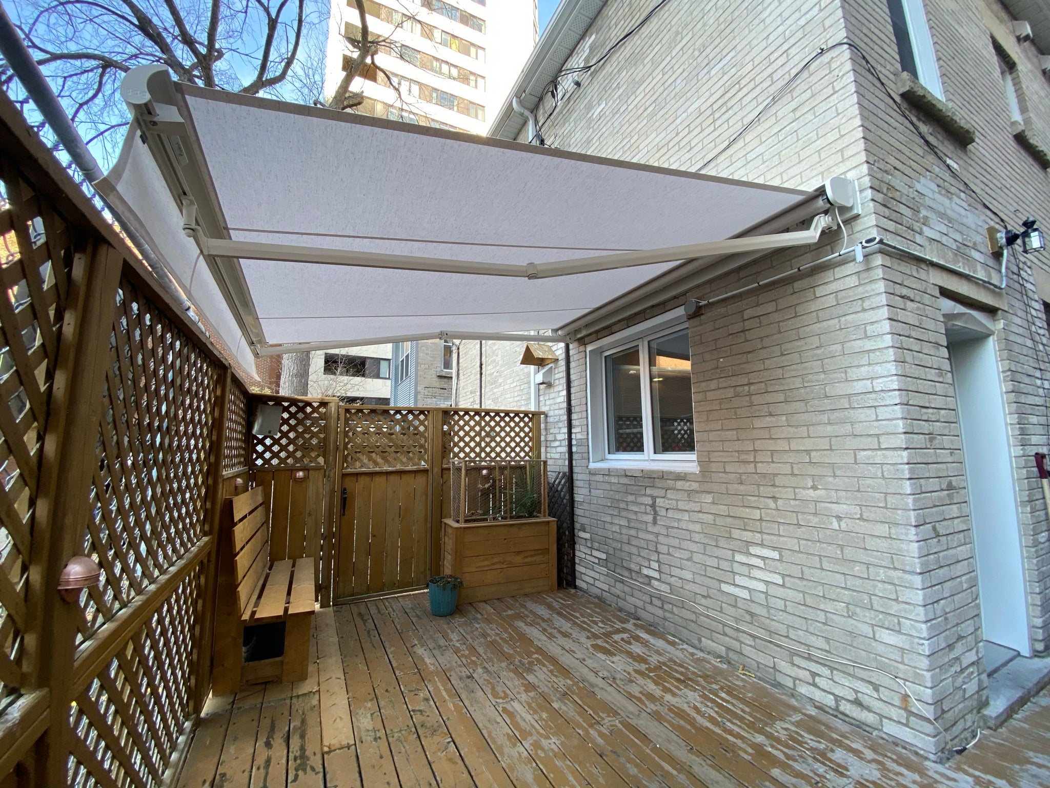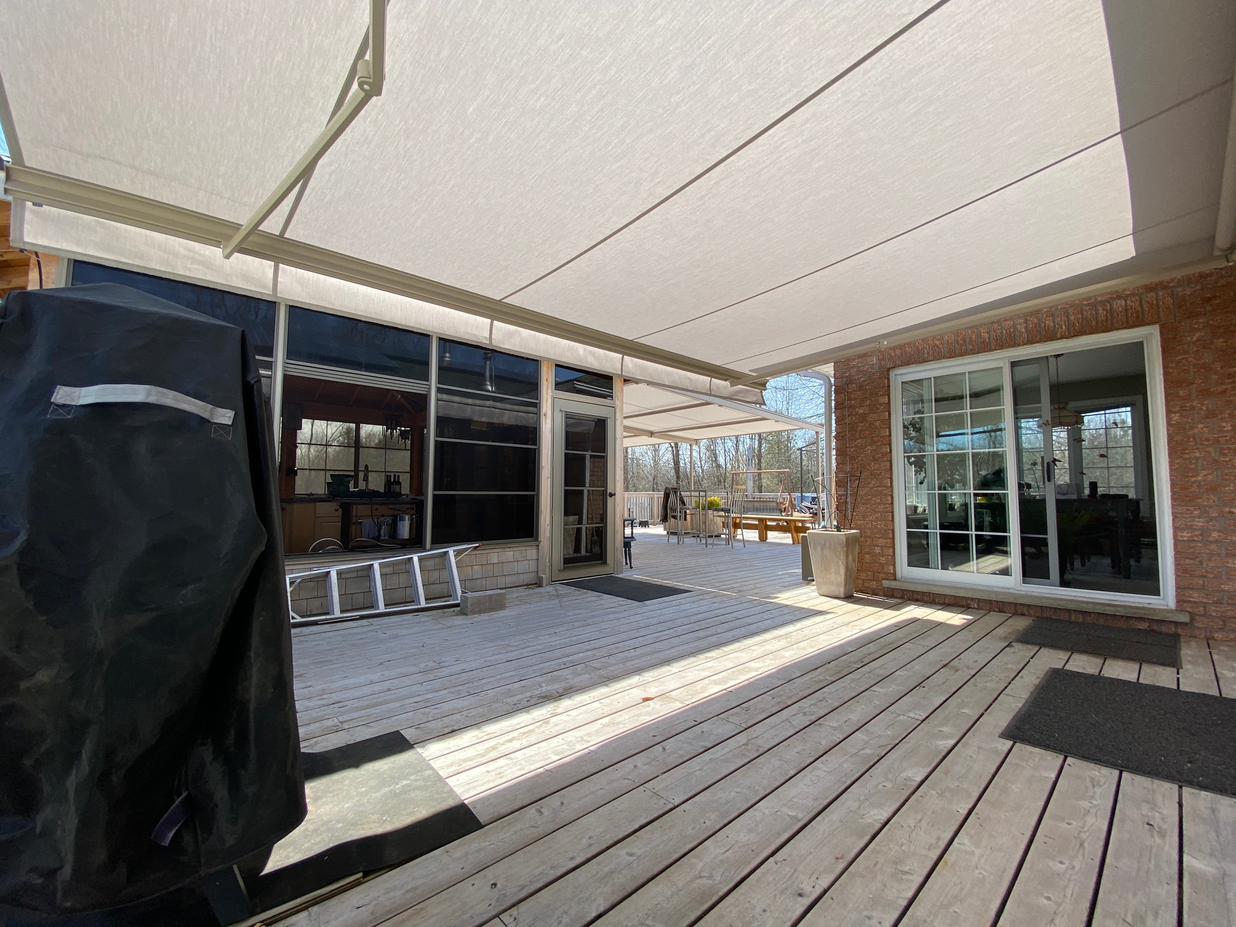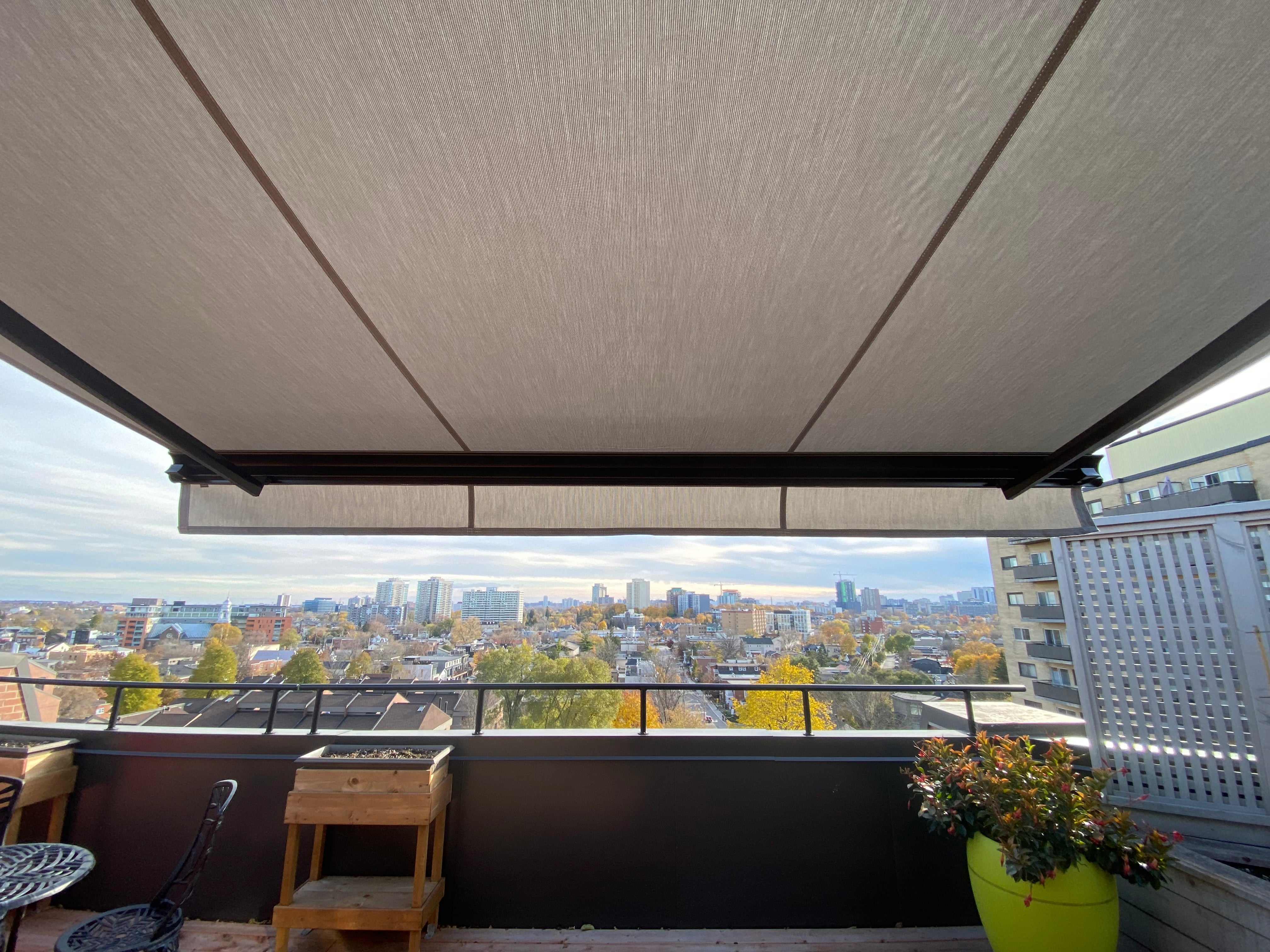 Select-Plus S8133: The Select-Plus can be used when more projection is needed than width. The overall width of the back bar awning is reduced to a minimum without affecting the projection through a special design with cross-over arms. Shade breaks at entrances, narrow roof terraces, window niches etc. can easily be covered. In rolled out position, the Select-Plus does not appear any different than a normal folding arm awning. Thereby, it is suited best for combination with other Select models. So, options like cover board or drop-down Volant-Plus valance are possible as well. The Select-Plus is available with either two or four folding arms, depending on its width.